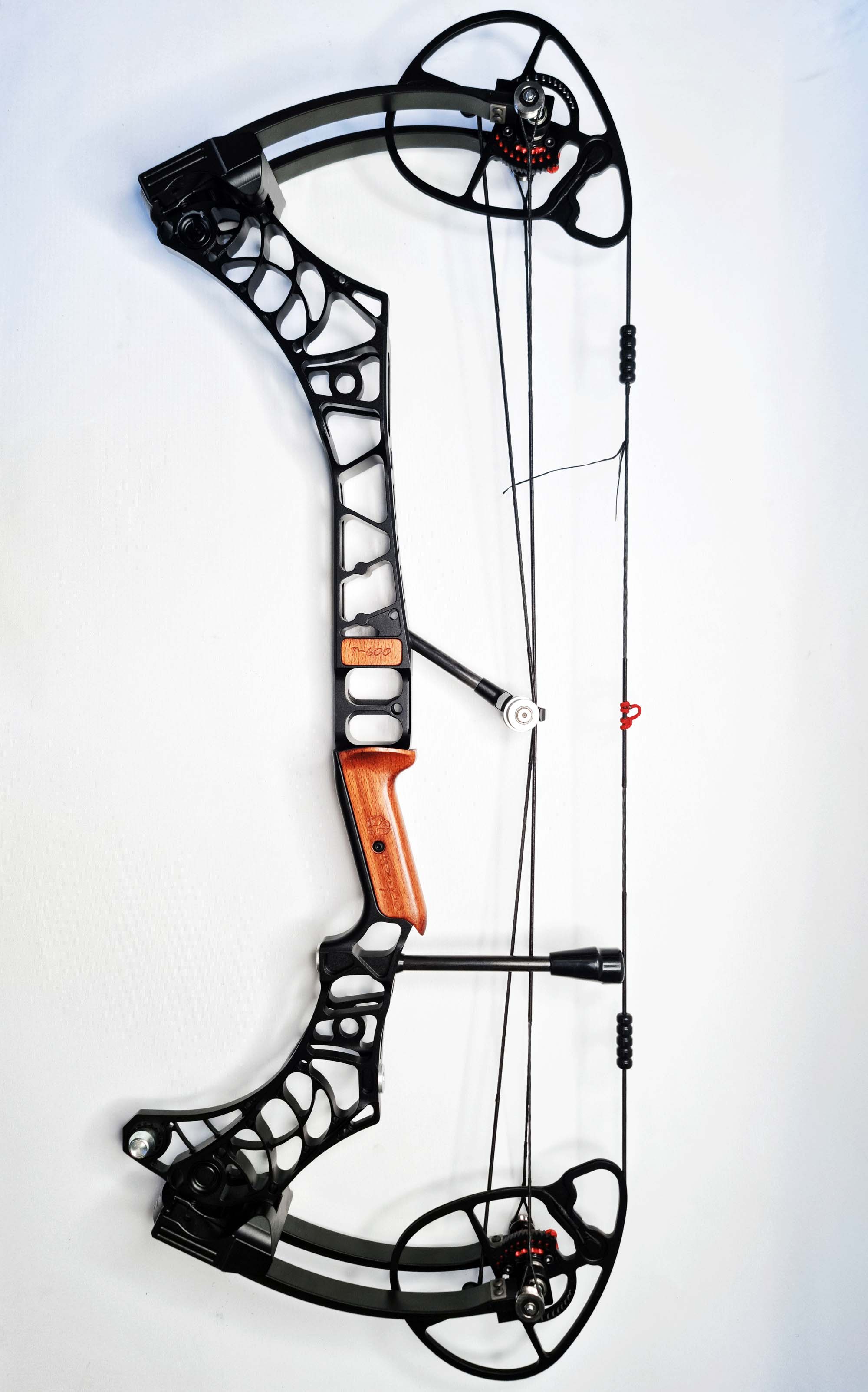Первое что бросается в глаза это рукоятка, полная копия райзера Mathews V3 фрезерованная из качественного сплава 6061 с всеми преимуществами. Тросоотвод расположен ровно по центршоту что уменьшает угол наклона тросов во время натяжения лука, что хорошо сказывается на синхронизации блоков, встроенный виброгаситель в раму лука гасит излишние вибрации. Дополнительное крепление для интегрированных полочек под ласточкин хвост.